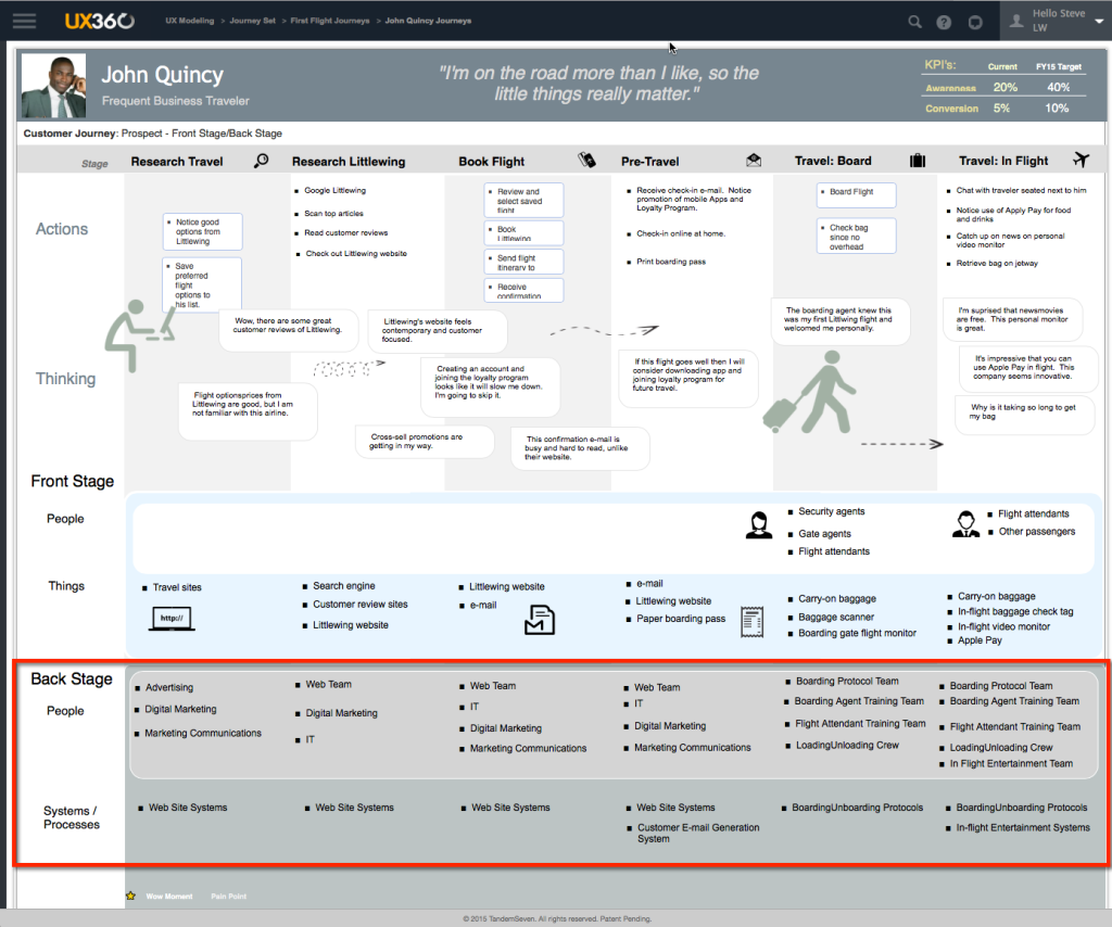 앞선 내용들은 Frontstage나 바깥의 Journey에 집중해 왔다. Backstage는 내부 시스템, 프로세스, 여정을 전달하는데 관여하는 사람들을 의미한다. 단일 Journey Map에 결합된 경우, 이 두 View를 Frontstage / Backstage 혹은 Eco-System Map이라고도 한다.