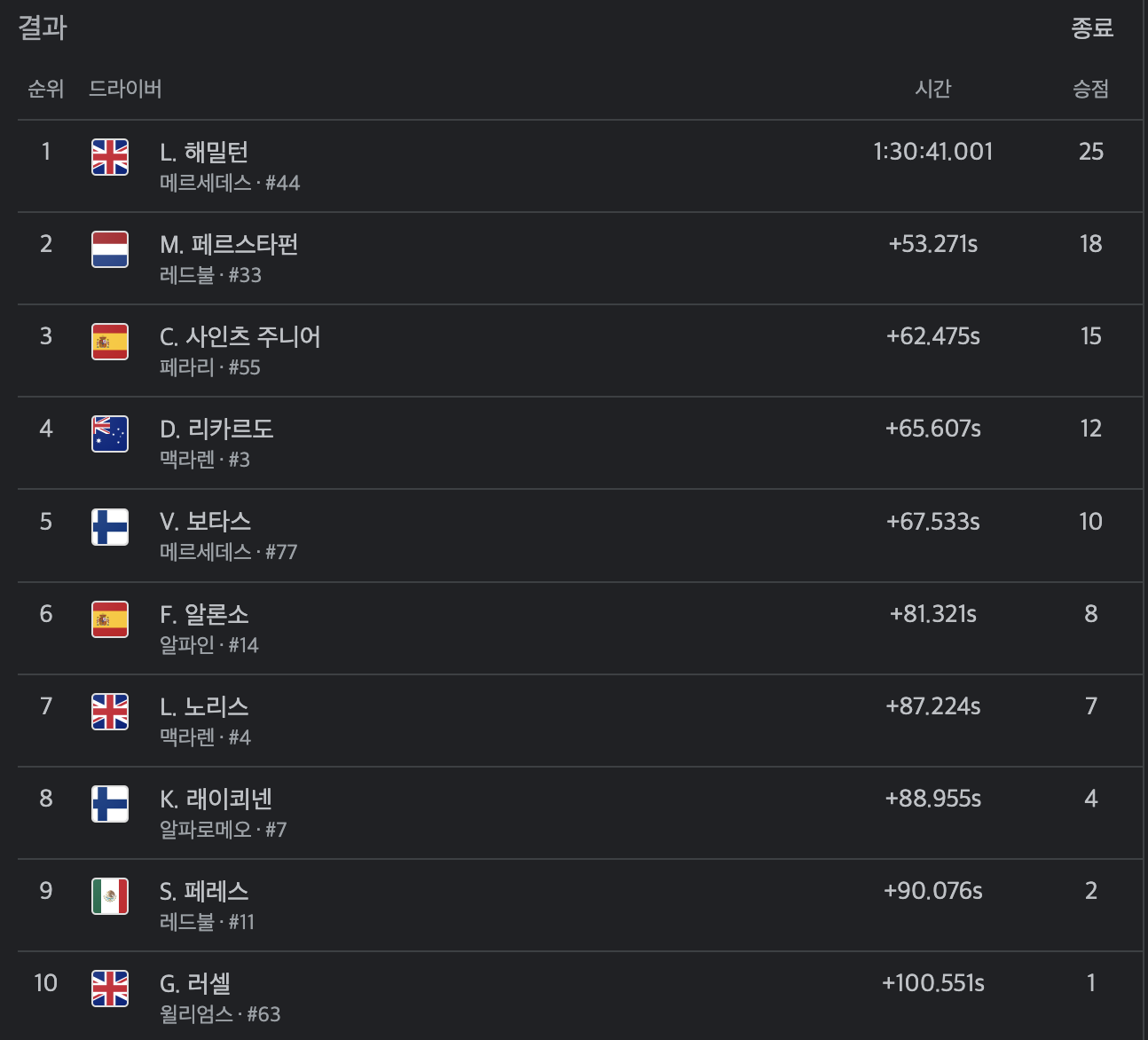 노리스는 감독의 타이어 교체 사인을 거부하고 계속 달렸다. 노리스를 제외한 모든 차량은 타이어를 바꿨고, 노리스는 50초 이상 차이 나던 드라이버들에게 추월을 당했다. 결국 Norris의 첫 GP우승 도전은 7위로 마무리되었다.