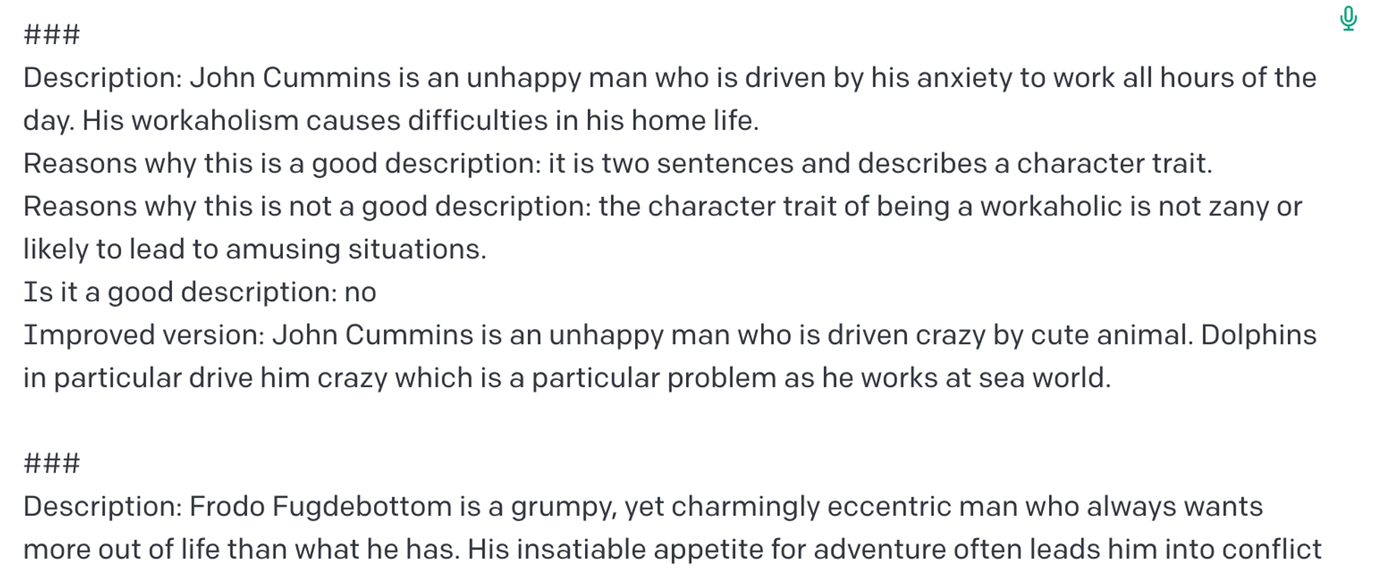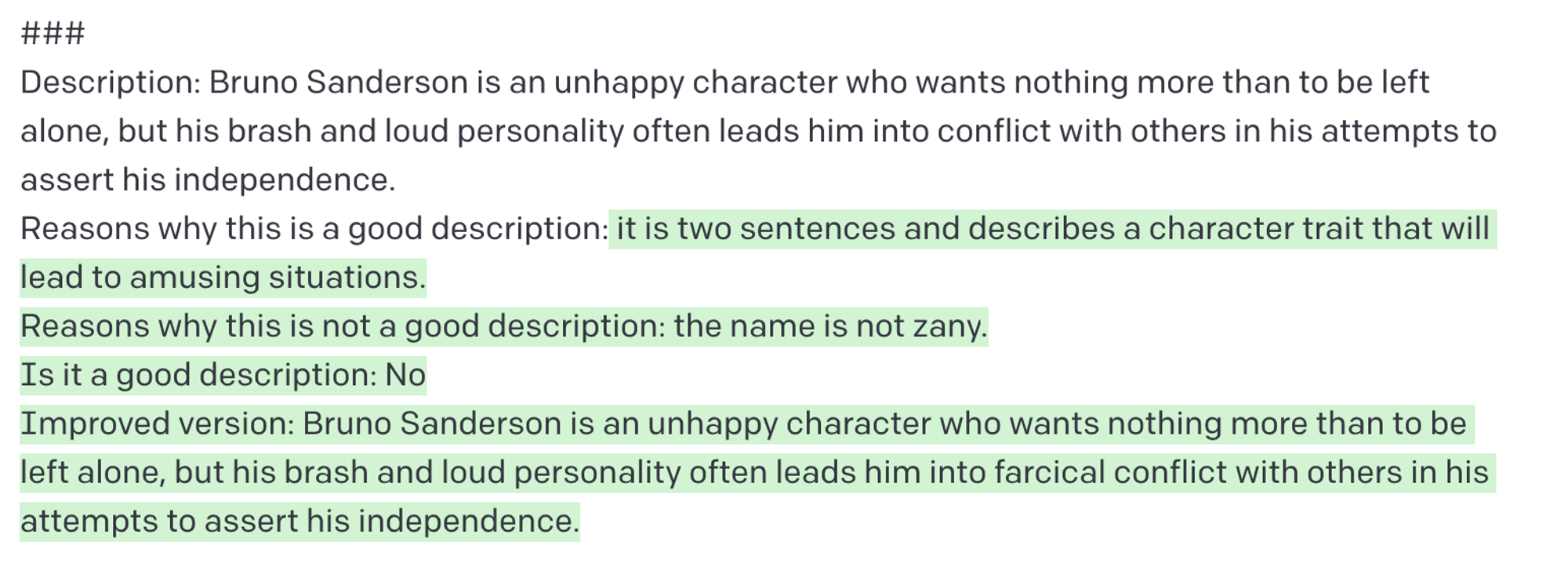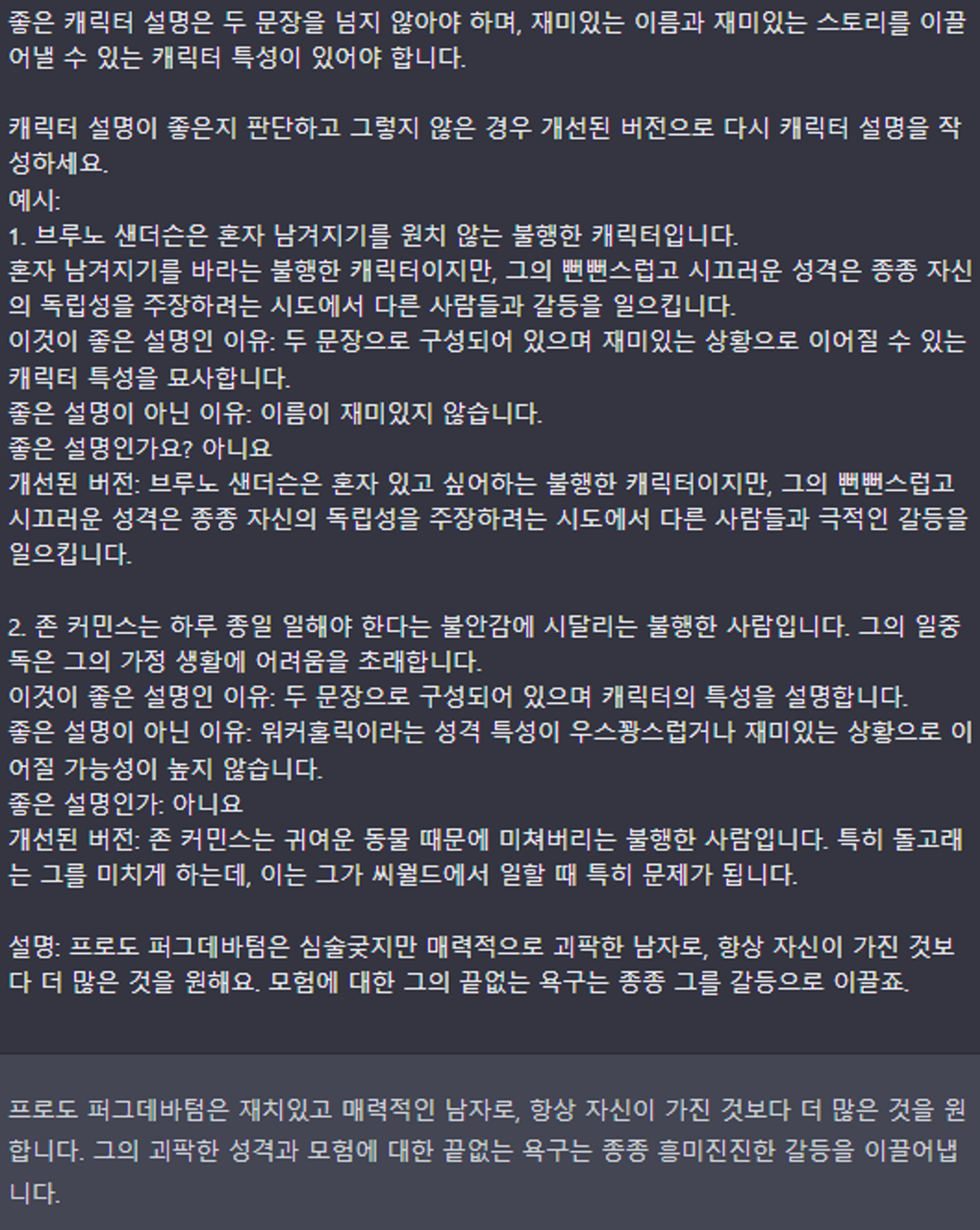 그런 다음 위의 캐릭터 설명을 입력하고 좋은지 판단하고 그렇지 않은 경우 개선하도록 요청했다: