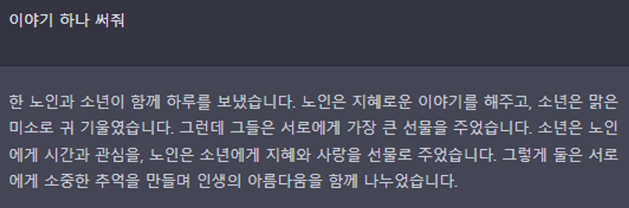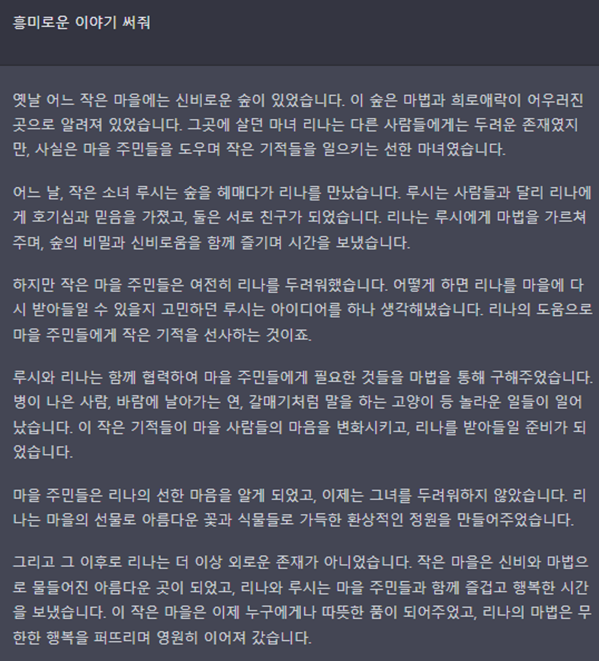 예를 들어 "이야기 써줘"라고 프롬프트하면 이야기를 쓰며, 매번 스토리가 다르다.