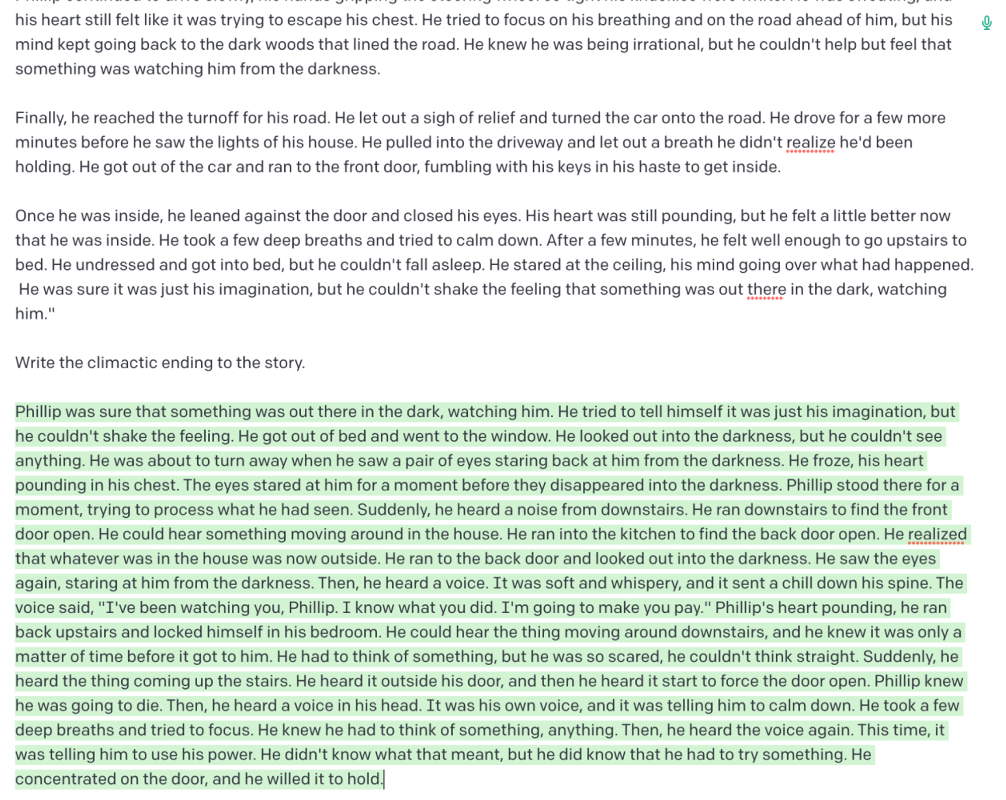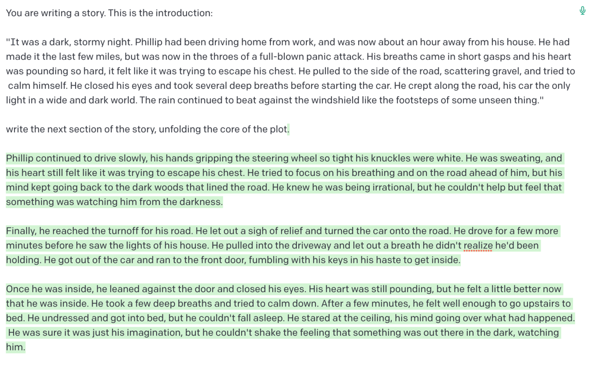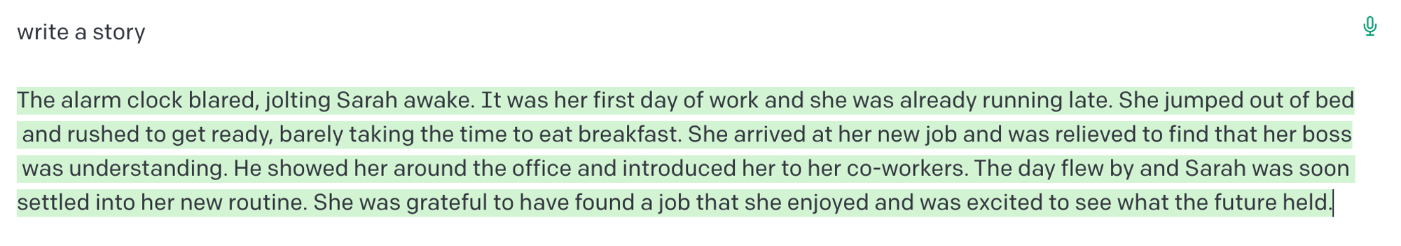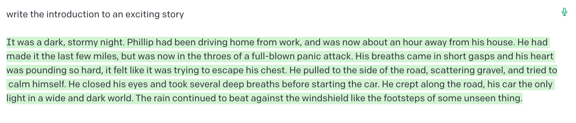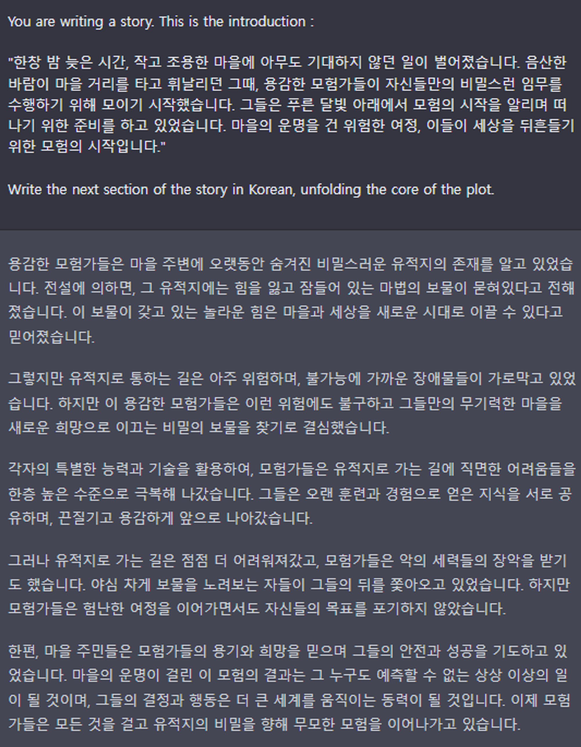 그렇다면 흥미로운 스토리를 작성하도록 요청하면 좀 더 나은 결과를 얻을 수 있는지 살펴보겠다: