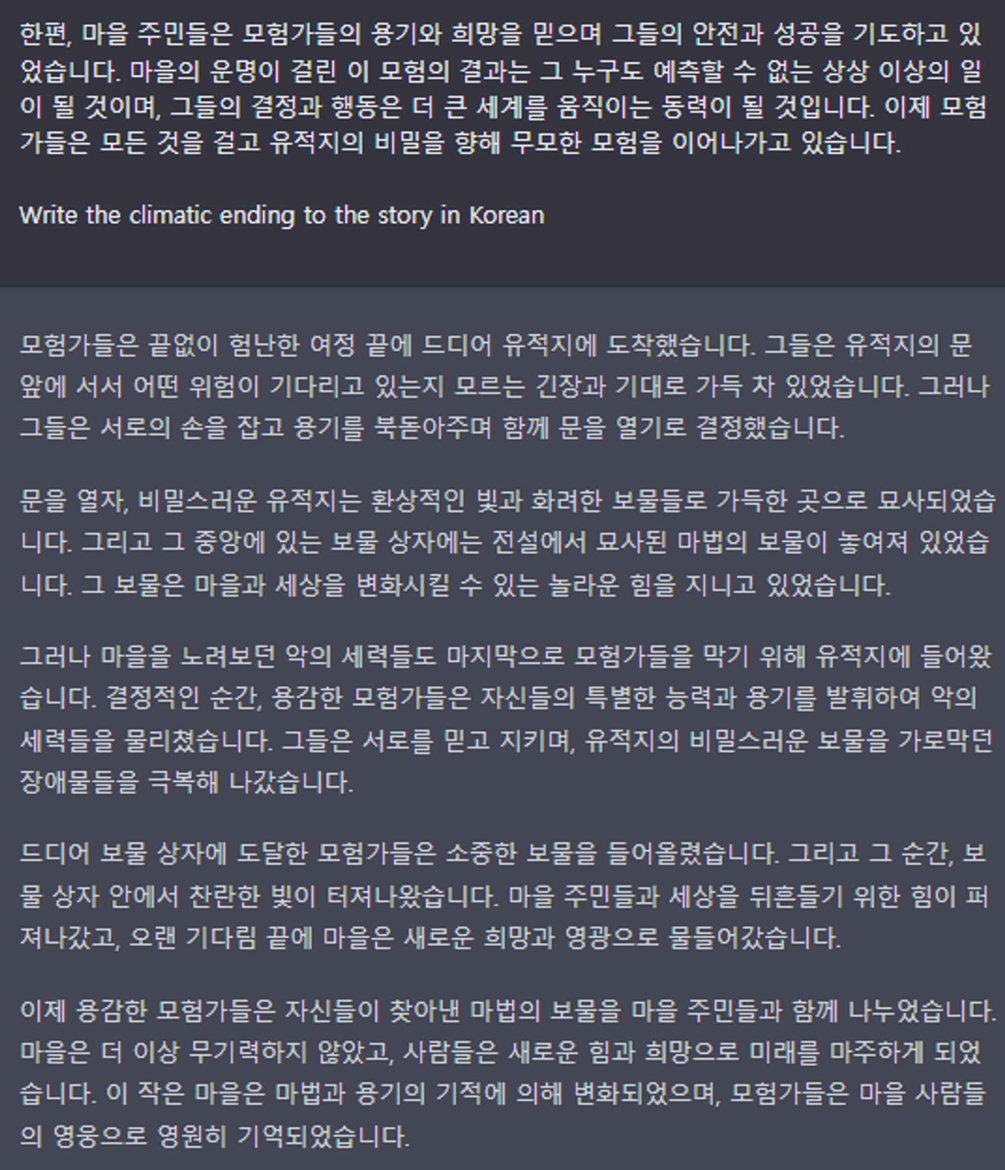 그런 다음 이 모든 것을 바탕으로 설득력 있는 클라이맥스를 작성하도록 요청할 수 있다: