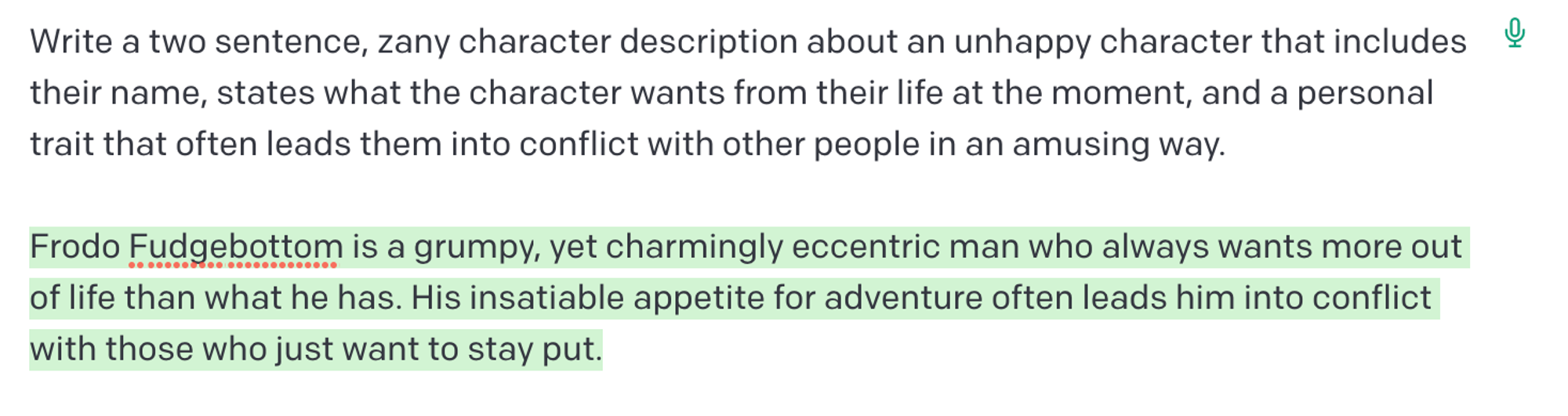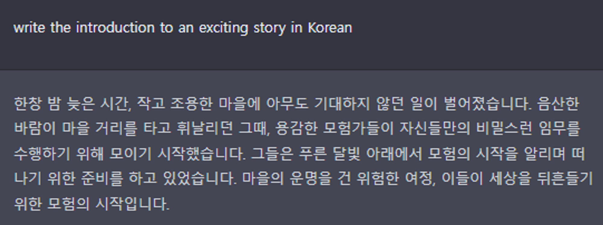 그렇다면 흥미로운 스토리를 작성하도록 요청하면 좀 더 나은 결과를 얻을 수 있는지 살펴보겠다: