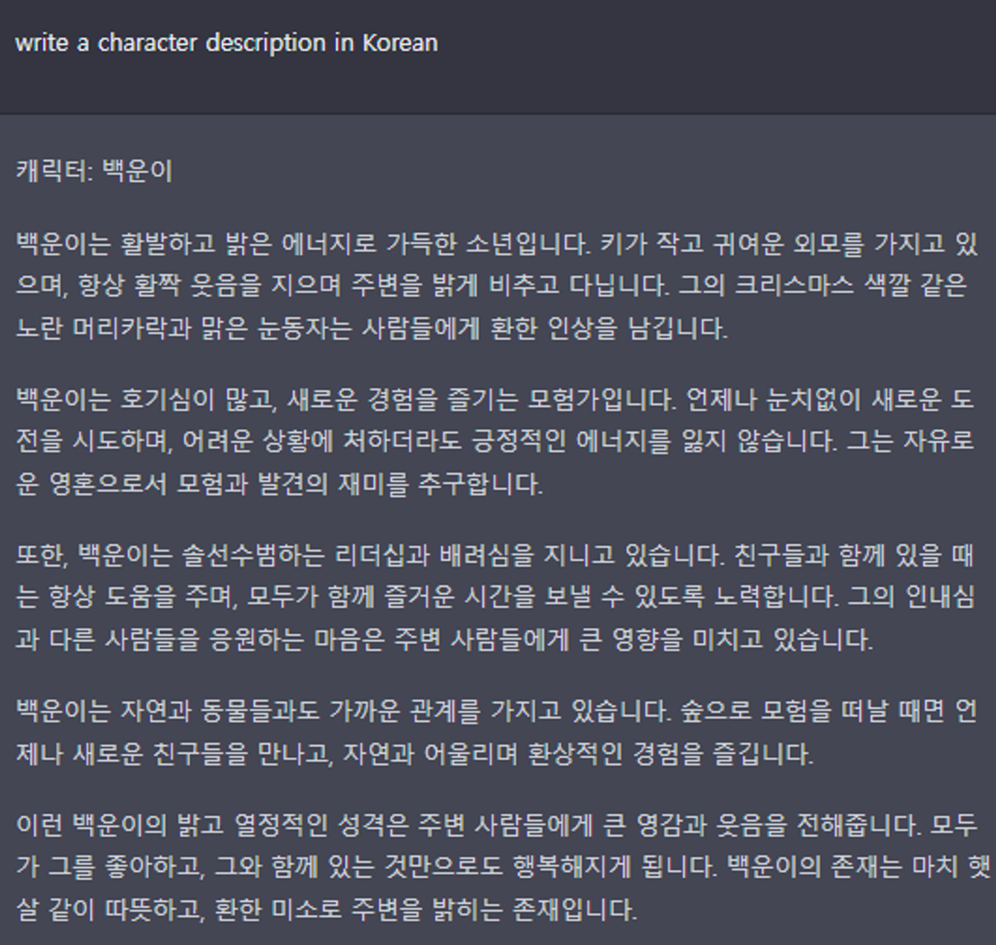 먼저 캐릭터에 대한 설명을 작성하도록 요청했다: