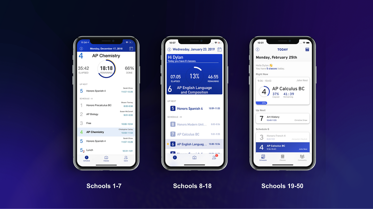 우리는 코네티컷주 웨스턴 고등학교 학생들을 위한 앱에 화이트 라벨을 붙이는 것으로 시작했습니다. 한 달 동안 학생 홍보대사와 함께 일하면서 학생의 복잡한 스케줄과 그로 인해 학생과 친구들이 겪는 어려움을 깊이 있게 이해했습니다. 그리고 나서 우리는 학생들의 일정을 완벽하게 지원하는 iWeston을 만들었습니다.