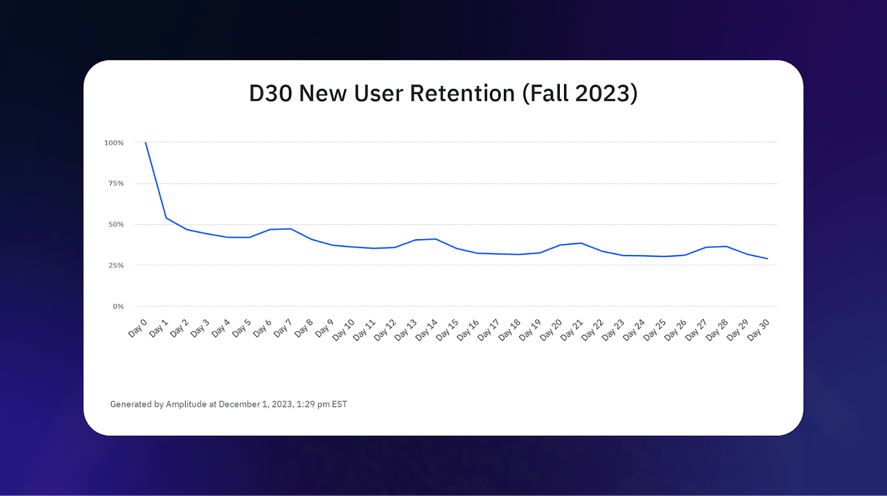 D30 리텐션에 대한 맥락을 설명하기 위해 Snap, TikTok, Twitter, Facebook의 D30 신규 사용자 리텐션은 모두 28%에서 40% 사이입니다(출처). 저희는 현재 30% 중반입니다.