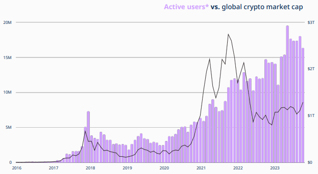 가격 변동에도 불구하고, 우리는 활동적인 사용자 수에서 4년 연속 두 자릿수 성장을 보았습니다. 이러한 통계는 암호화폐에 대한 지속적인 관심과 사용의 확대를 나타냅니다.