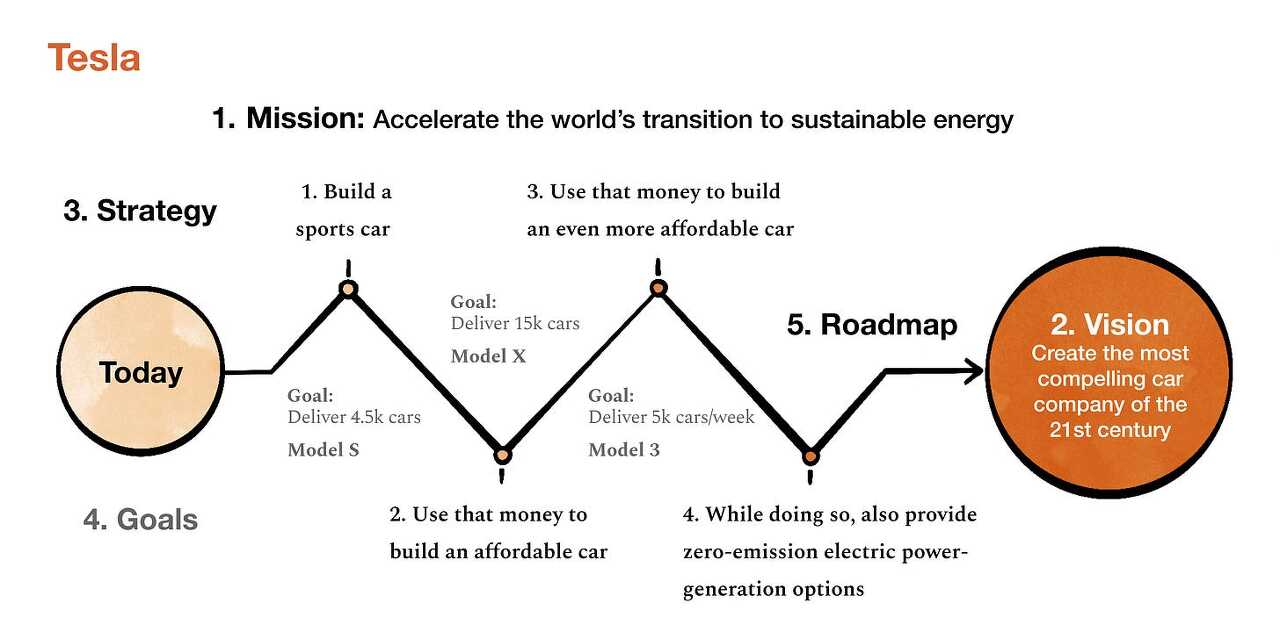 Tesla: 내러티브 스타일, 문제에 대한 상세한 식별, 마지막에 나오는 매우 간단하고 야심차면서도 명확한 4단계 전략에 주목하세요.