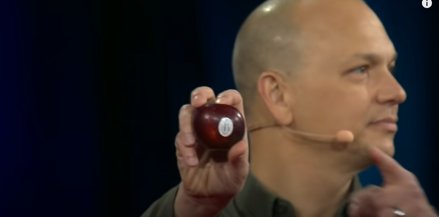 제품 디자이너로써, 제 일은 주변 모든 것을 보고, 느끼고 향상시키는 것입니다. 예를 들면요, 이 과일에는 스티커가 보입니다. 이 스티커는 옛날에는 없었습니다. 하지만 세월이 흐르고, 누간가가 과일에 스티커를 붙이는 놀라운 생각을 해낸거죠. 스티커를 붙이는 것은 슈퍼마켓에서 과일을 확인할 때 편하기 때문입니다. 우리는 빠르게 쇼핑을 할 수 있게 되었습니다.