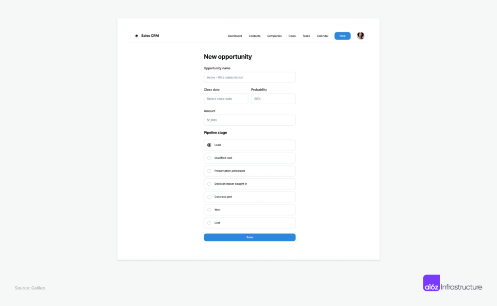 예를 들어, Salesforce나 Netsuite를 사용해 본 사람은 끝없는 탭과 필드를 잘 알고 있을 것입니다. 워크플로우가 복잡해질수록 화면을 더 많이 차지합니다. 대부분의 엔터프라이즈 소프트웨어가 기본 데이터베이스 스키마를 반영하며, 각 읽기 및 쓰기는 자체 화면 자산을 필요로 한다고 해도 과언이 아닙니다.