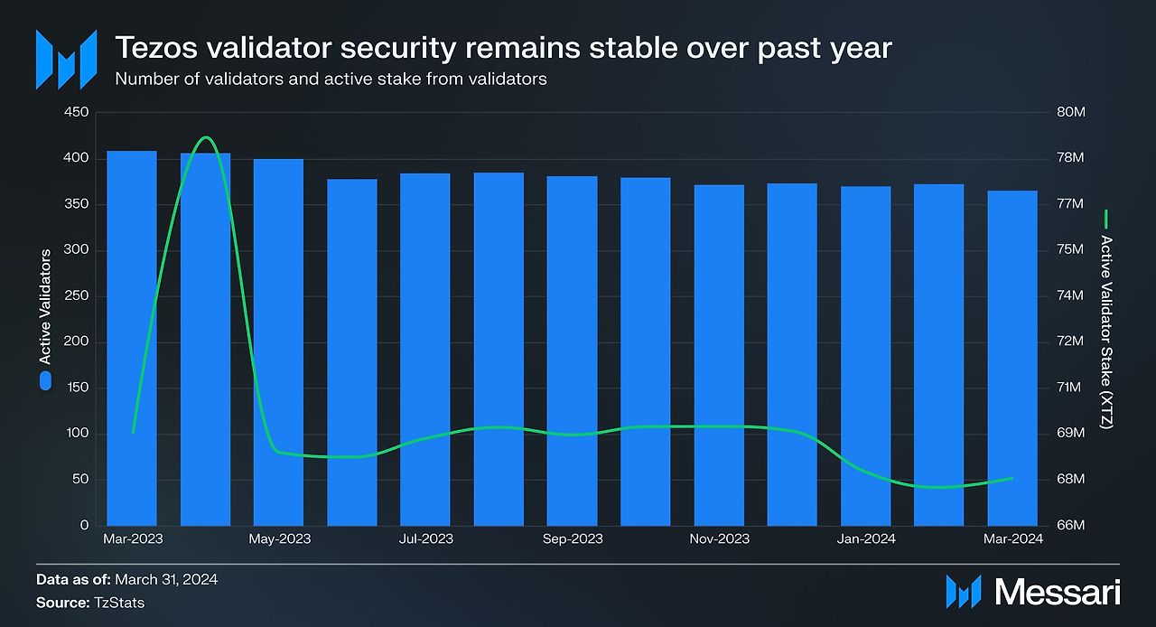 Tezos는 네트워크를 보호하기 위해 XTZ를 담보로 스테이킹하는 Liquid Proof-of-Stake 메커니즘을 사용합니다. Tezos 생태계에서는 검증자(베이커)와 위임자가 스테이킹을 통해 보상을 받습니다. 지난 3분기 동안 활성 검증자 수와 활성 스테이크는 안정적이었습니다. 1분기 동안 활성 검증자는 0.5% 감소하고 활성 스테이크는 1.5% 증가했습니다.