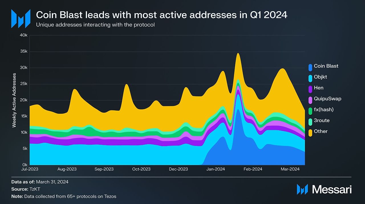 2023년 4분기에 출시된 소셜 게이밍 애플리케이션 Coin Blast는 주간 평균 7,000명의 활성 사용자를 기록하며 가장 큰 프로토콜로 빠르게 성장했습니다. Tezos에서 게임을 하는 활성 주소는 557% 증가해 2024년 1분기에 97,000개의 고유 주소와 상호 작용했습니다. 게임과 관련된 계약 호출은 1,815% 증가해 총 170만 번의 상호 작용이 발생했습니다. 이는 Tezos 생태계가 새로운 사용 사례에 적응하고 있음을 보여줍니다.