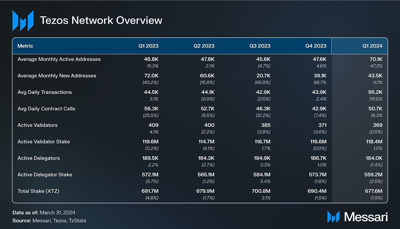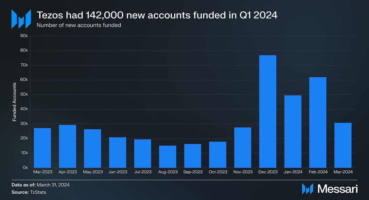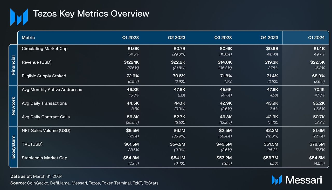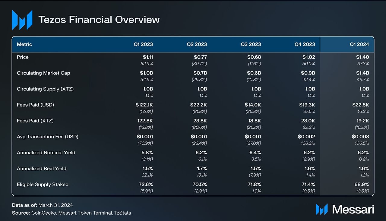 2024년 1분기 XTZ의 시가총액은 10억 달러를 돌파하여 분기 말까지 거의 14억 달러에 도달하여 QoQ 50% 증가했습니다. 이 성장은 2023년 4분기 말 비트코인 ETF 출시와 소매 투자자들의 관심이 다시 증가한 것에 따른 것입니다.