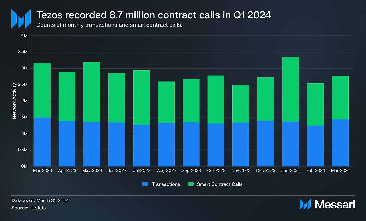 스마트 계약 호출은 2024년 1분기에 17% 증가하여 460만 건에 도달했습니다. 이는 2024년 1월에 연간 최고치인 200만 건의 계약 호출에 의해 주도되었습니다. 전체 트랜잭션 수는 QoQ 410만 건으로 안정적으로 유지되었습니다. 전체 네트워크 활동(계약 호출 및 트랜잭션)은 8% 증가하여 1분기에 총 870만 건에 달했습니다. 이 활동은 XTZ 전송보다는 Tezos에 구축된 애플리케이션과의 상호 작용에 의해 주도되었습니다.