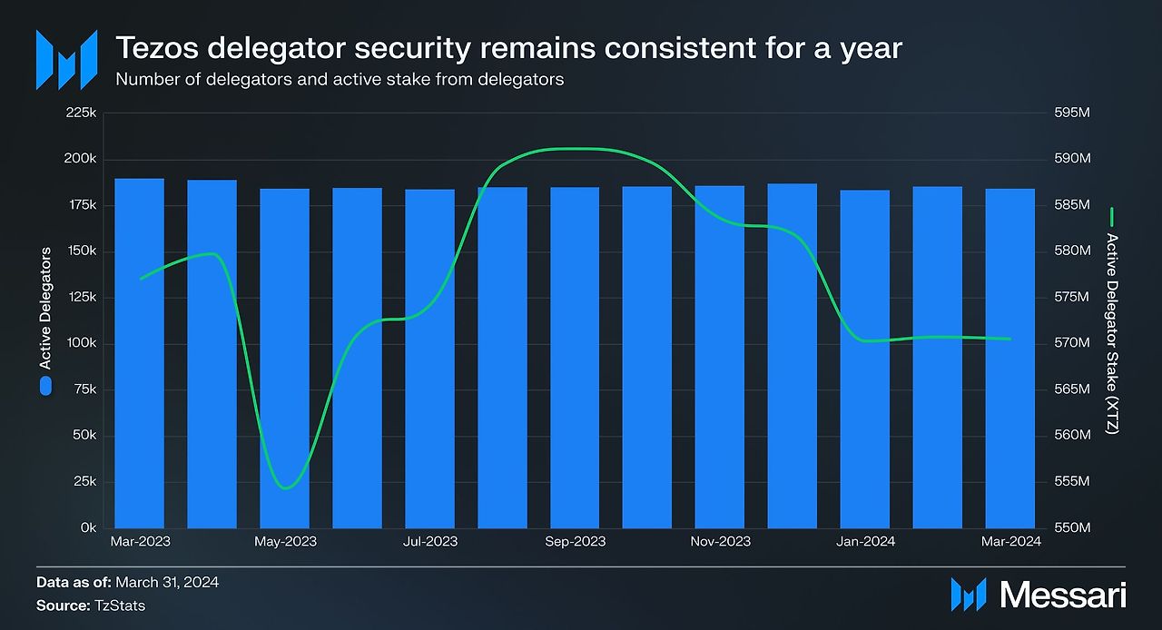 위임자들은 활성 검증자에게 XTZ를 스테이킹하고 거래 수수료와 보상의 일부를 받습니다. 1분기 동안 활성 위임자와 위임된 스테이크는 각각 1.4%와 2.5% 감소했습니다.