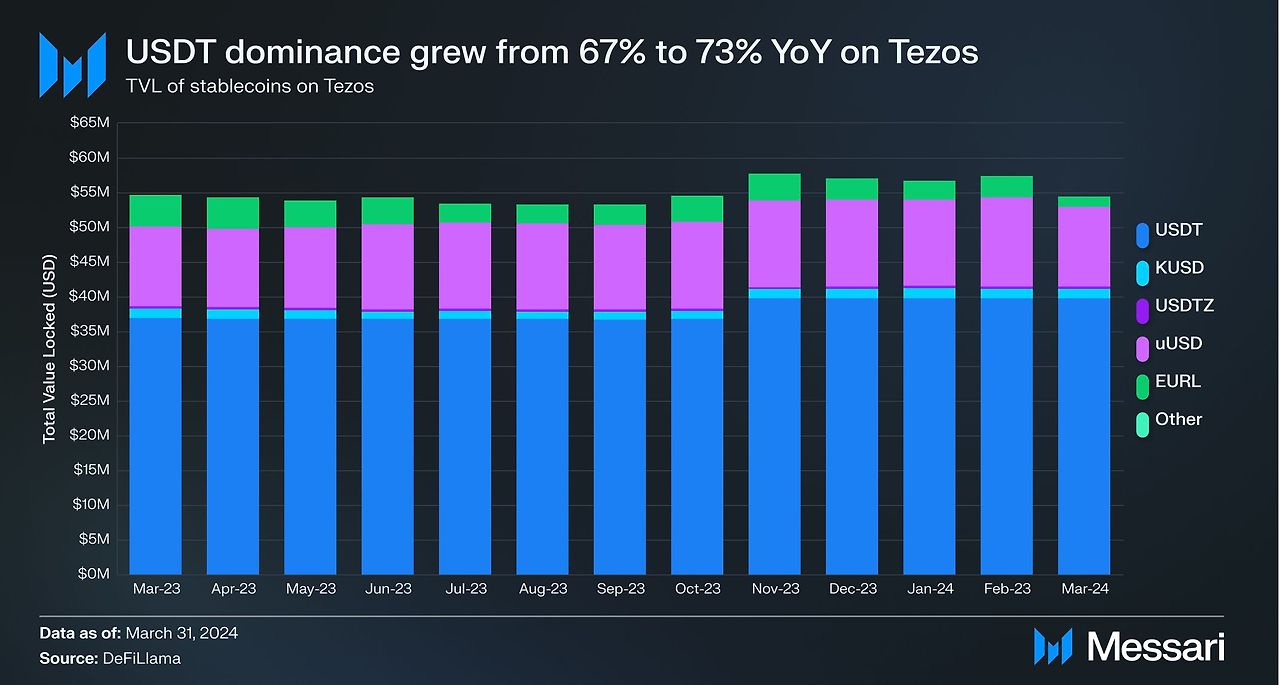 Tether의 USDT는 연간 기준으로 스테이블코인 시장에서 점유율을 67%에서 73%로 늘렸습니다. 2024년 1분기 말까지 Tezos에서 발행된 USDT는 3,900만 달러를 넘었습니다. Tezos에서 독점적으로 발행된 주요 스테이블코인은 Kolibri의 kUSD와 USDTez의 USDtz로, 각각 100만 달러와 25만 달러 이상 발행되었습니다.