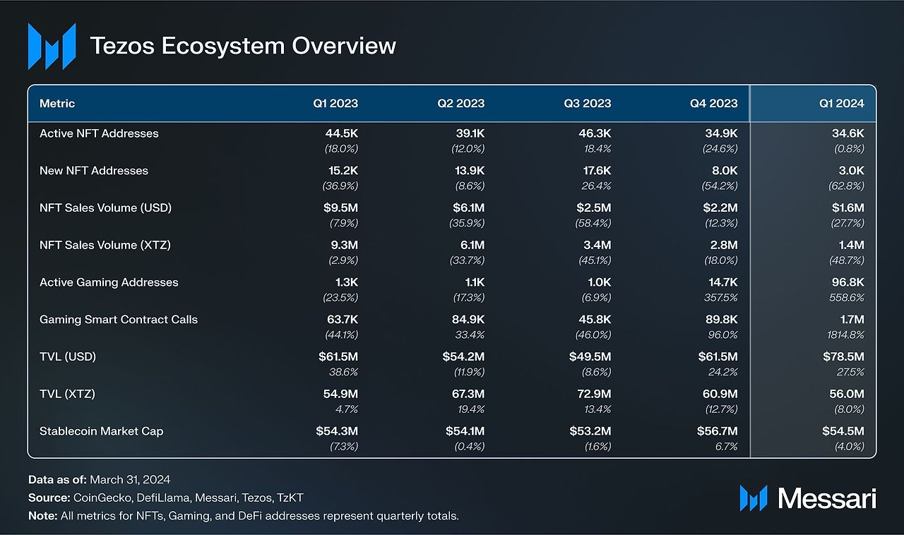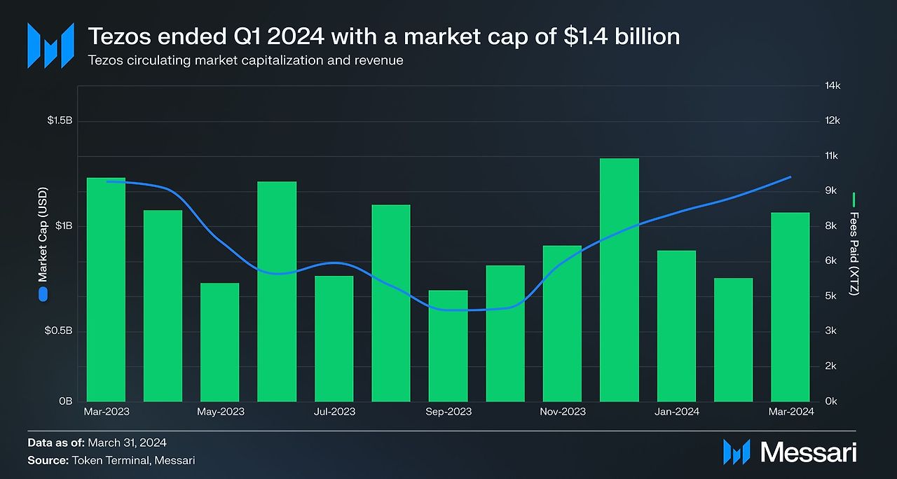 2024년 1분기 XTZ의 시가총액은 10억 달러를 돌파하여 분기 말까지 거의 14억 달러에 도달하여 QoQ 50% 증가했습니다. 이 성장은 2023년 4분기 말 비트코인 ETF 출시와 소매 투자자들의 관심이 다시 증가한 것에 따른 것입니다.