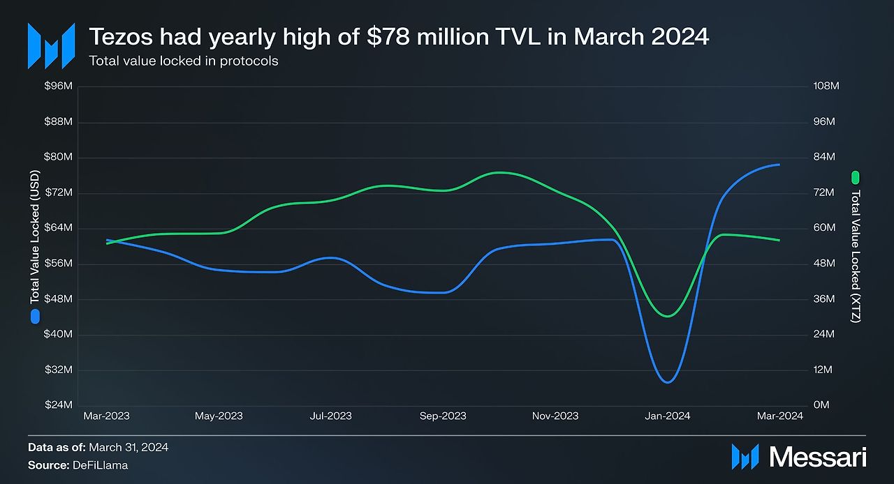 2024년 1분기에 USD 기준 총 예치 자산(TVL)은 전 분기 대비 28% 증가하여 연간 최고치인 7,800만 달러를 기록했습니다. 이 증가는 XTZ 가격 상승의 영향을 일부 받았으며, XTZ의 TVL은 전 분기 대비 8% 감소했습니다.
