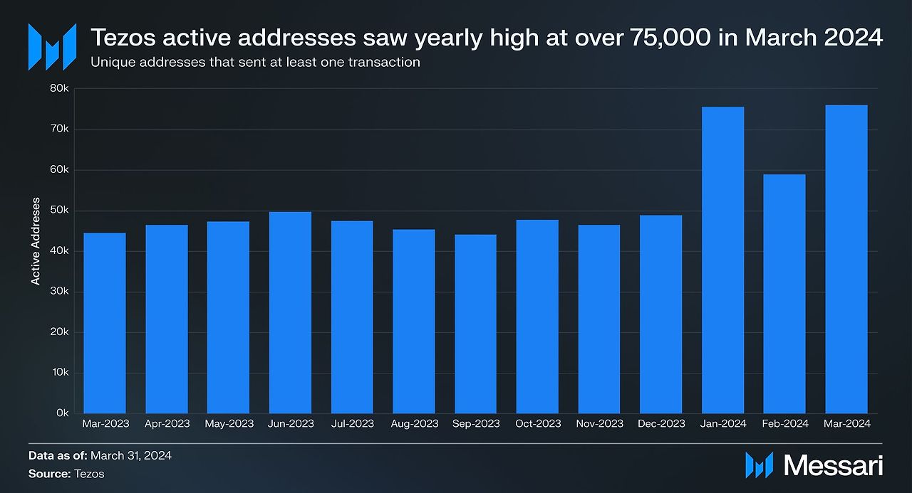 Tezos는 2024년 3월에 월간 활성 주소 수에서 연간 최고치를 기록했으며, 75,000개 이상의 고유 주소가 네트워크와 상호 작용했습니다. 2024년 1분기 평균 월간 활성 주소 수는 70,000개로 QoQ 37% 증가했습니다. 처음으로 네트워크와 상호 작용하는 주소를 계산하는 평균 월간 신규 주소는 2024년 1분기에 44,000개로 QoQ 50% 증가했습니다.