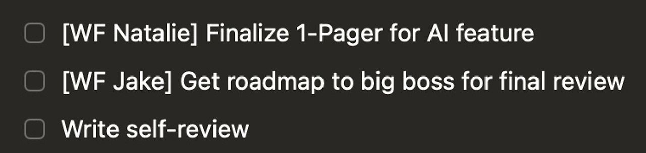 이 방법도 Getting Things Done 프레임워크에서 나온 것으로, 제 인생을 바꿨습니다. 가장 효과적인 PM의 중요한 습관 중 하나는 "내가 다 알고 있다"는 분위기를 조성하는 것입니다. 이 방법을 통해 메모리에 의존하는 대신 모든 열린 작업을 추적할 수 있어 다른 사람이 일을 제대로 하지 않을 때 체크하기도 쉽습니다. 정보를 어딘가에 기록해 두면, 뇌가 긴장을 풀고 더 가치 있는 생각을 할 공간을 만들어 줄 수 있습니다.