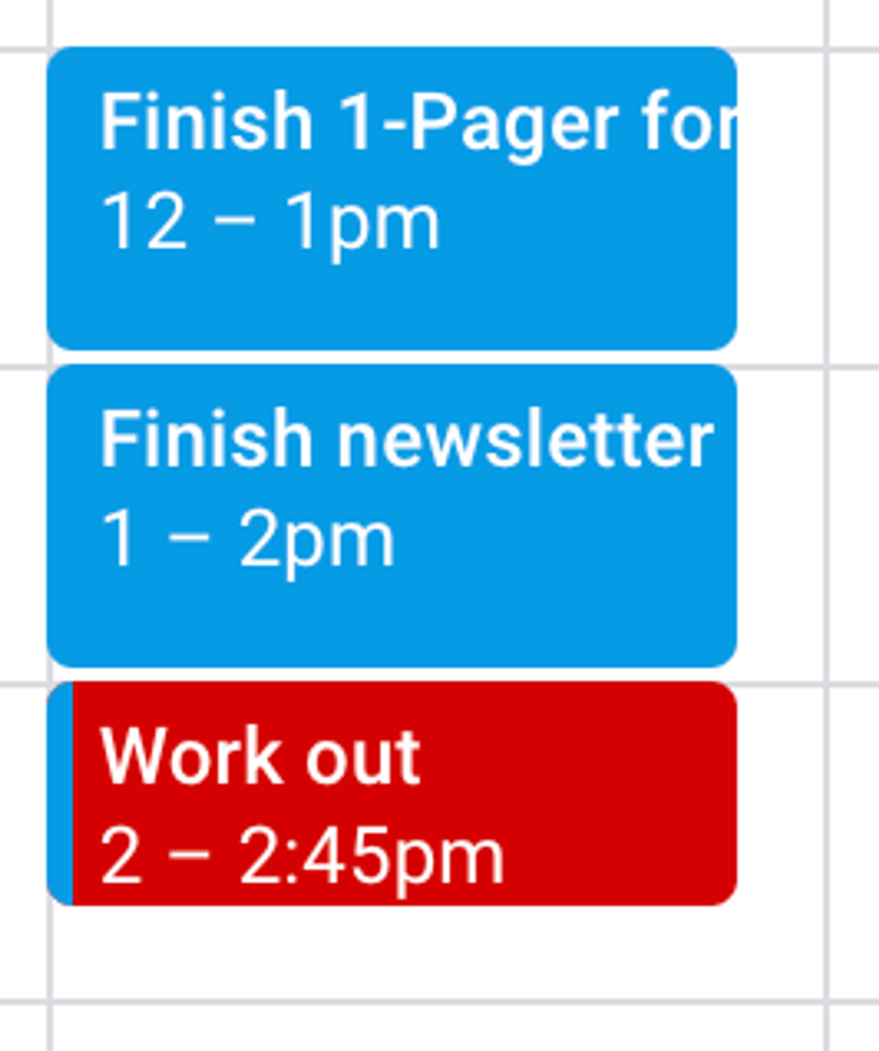 할 일을 앱에 추가하는 대신, 캘린더에 시간대를 지정해보세요. 이 작업을 위해 특별한 도구가 필요하지 않습니다. 할 일을 이벤트로 만들어 캘린더에 추가하기만 하면 됩니다.