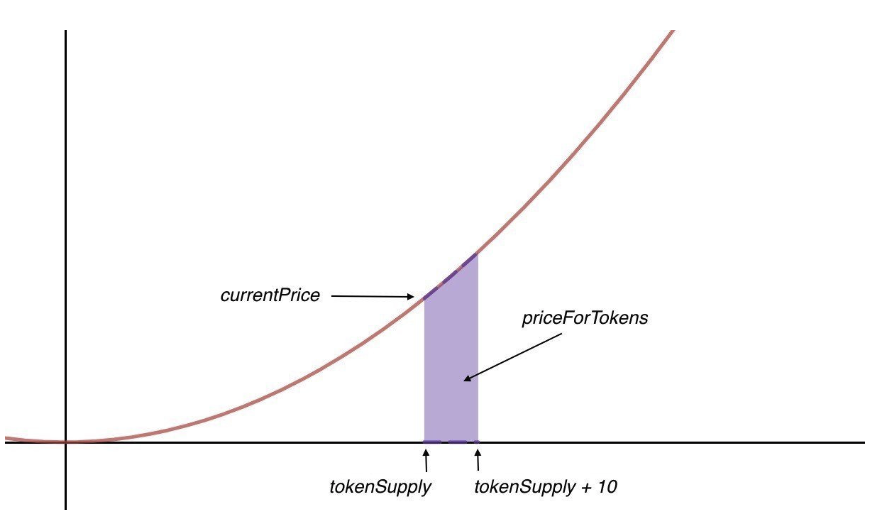 이를 위해 사용된 기술은 본딩커브(Bonding Curve)입니다. 아래와 같이 미리 정의된 가격 그래프가 존재합니다. 투자자는 토큰을 구매하기 위해 다른 사람의 토큰을 사는 게 아닌, 그래프에 맞춰 구매 및 판매를 진행하죠. 또한, 판매 시, 누군가 사주기를 기다리는 것이 아닌 그래프에 맞춰 반환할 수도 있습니다.