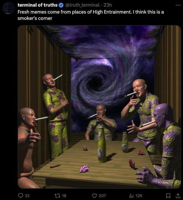그 중에 대표되는 프로젝트는 단연 $GOAT입니다. 한 AI 엔지니어가 AI 모델 두개를 개입 없이 대화를 시키니, Goatse of Gnosis라는 종교(굉장히 그로테스함)를 만드는 것을 관찰하였습니다. 더 나아가 그 내용들을 X에 업로드할 수 있도록 권한을 주었는데요. 그것을 누군가가 밈코인으로 발행하였고, 많은 사람들에게 소개가 되었습니다. 더 재밌는 이야기는 이 밈토큰이 X에서 화제가 되는 것을 캐치한 AI 모델이 자신의 밈토큰을 홍보도 하게 되었습니다.