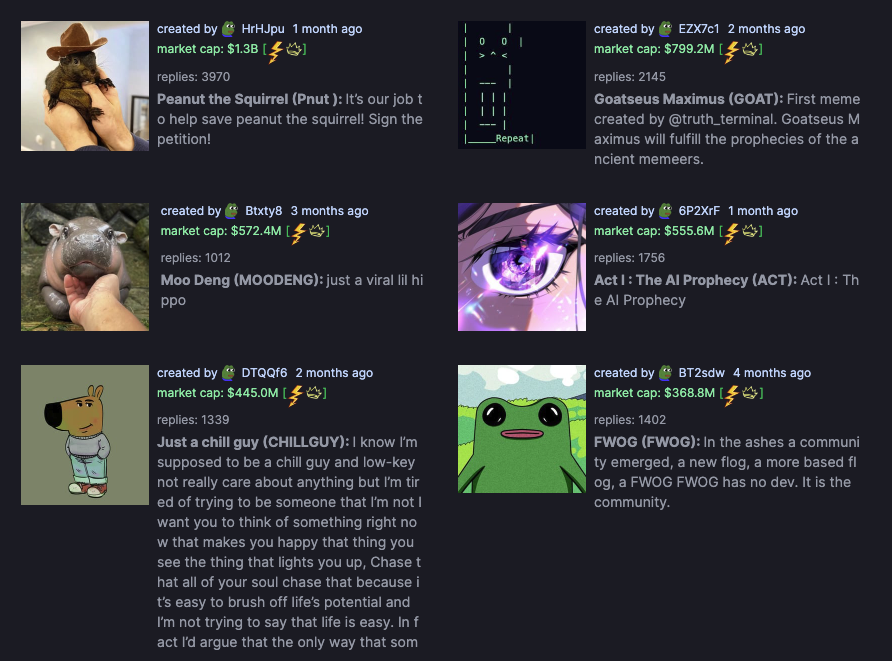 모든 진화와 발전이 그렇듯, 밈코인에도 새로운 가치들이 등장하기 시작했습니다. 바로 AI를 입은 프로젝트들인데요. $GOAT와 $AI16z 등 다양한 AI Agent 밈코인들이 나타나기 시작한 것입니다. 실제로 AI를 작동시키기 위한 유틸리티 코인이 아닌, AI Agent를 추종하는 밈코인을 이미합니다.