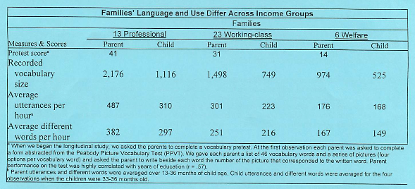 관찰 데이터의 평균을 14시간의 깨어 있는 하루를 기준으로 주당 100시간으로 선형적으로 추정해 보면, 전문직 가정의 평균 아이는 언어 경험으로 21만5천 단어를, 노동계층 가정의 평균 아이는 12만5천 단어를, 복지 가정의 평균 아이는 6만2천 단어를 들었습니다.