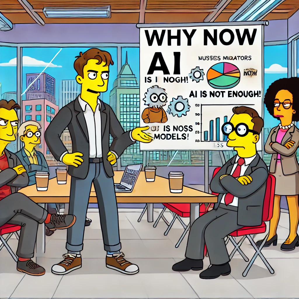 심슨 스타일로, 스타트업 창업자가 투자자와 미팅하는 장면을 묘사한 이미지를 제작하겠습니다. 창업자는 AI 관련 피치를 하고 있지만, 투자자는 "AI만으로는 충분하지 않다"는 표정을 짓고 있습니다. 화이트보드에는 ‘Why Now?’라는 질문과 함께, AI 외의 차별화 요소를 고민하는 모습이 표현됩니다. 😊🎨