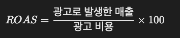 ROAS(Return On Ad Spend)는 광고 비용 대비 얻은 매출의 비율을 나타낸다.